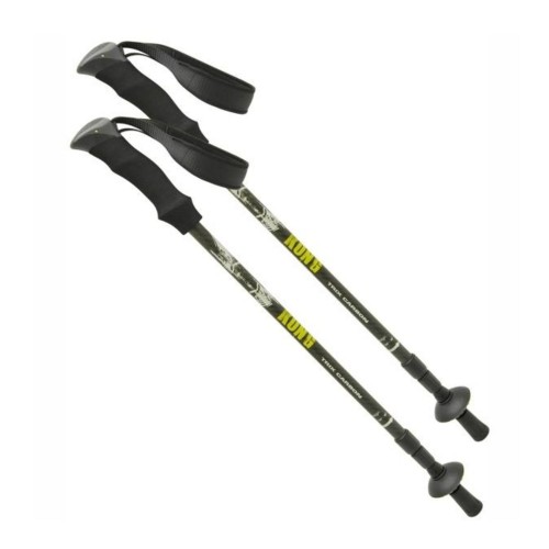 Baston de senderismo super ligero, solo 200 gramos. Compuesto de tres segmentos telescópicos y con ajustes por muescas, longitud máxima 141cm. El primer segmento esta hecho de carbono, los otros son de aluminio para asegurar la máxima ligereza y flexibilidad / resistencia a la compresión. Empuñadura ergonómica y cinta ajustable para un perfecto agarre en cada situación.