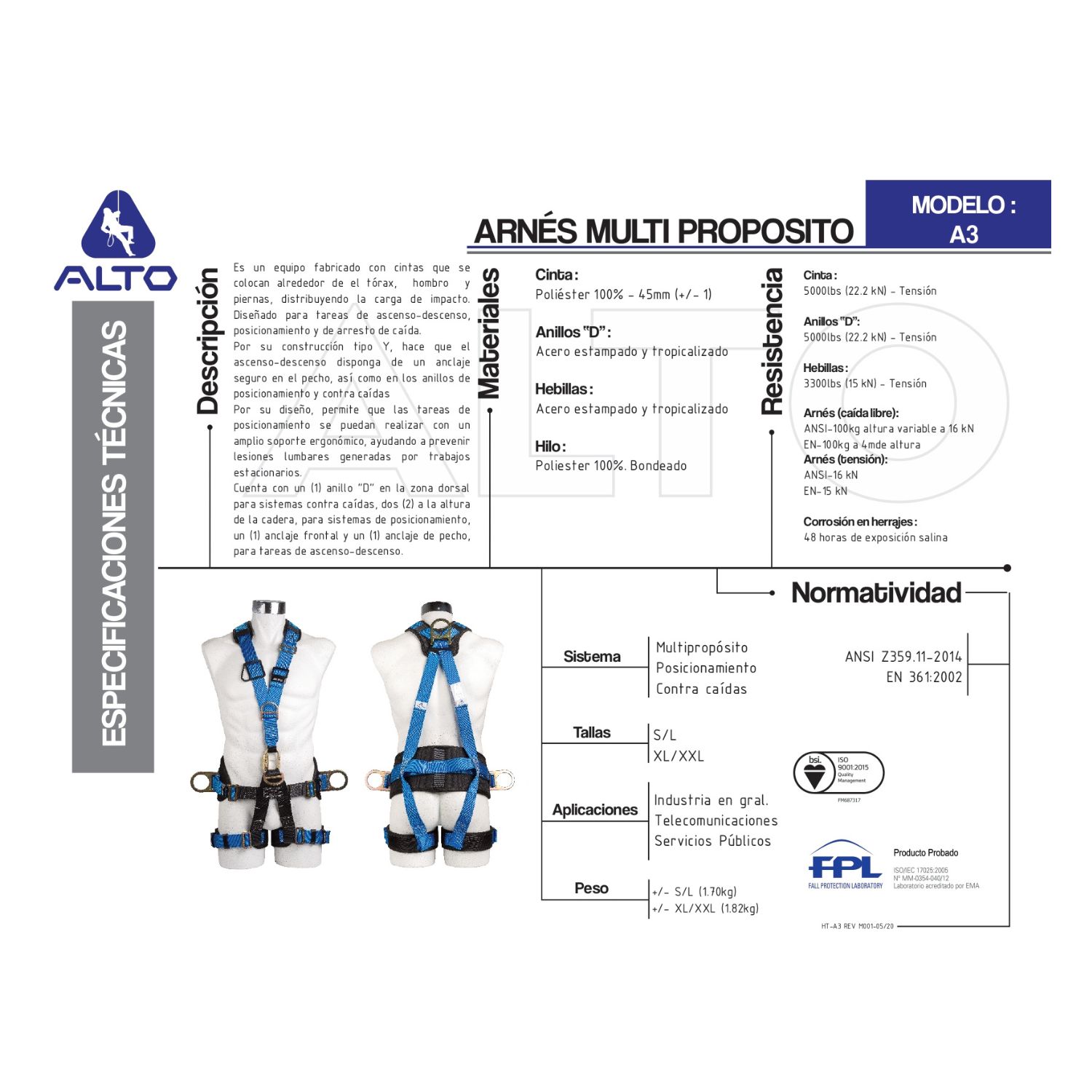 Diseñado para tareas de ascenso-descenso, posicionamiento y de arresto de caída.