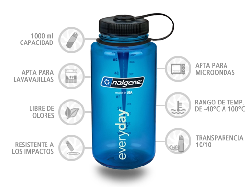 La botella de boca ancha de Nalgene es el producto más popular. Sus 53 mm de boca permite la cómoda introducción de cubitos de hielo y facilita su limpieza. Se acopla a la mayoría de purificadores de agua y filtros de mercado. El tapón incorpora una arandela para evitar su pérdida.