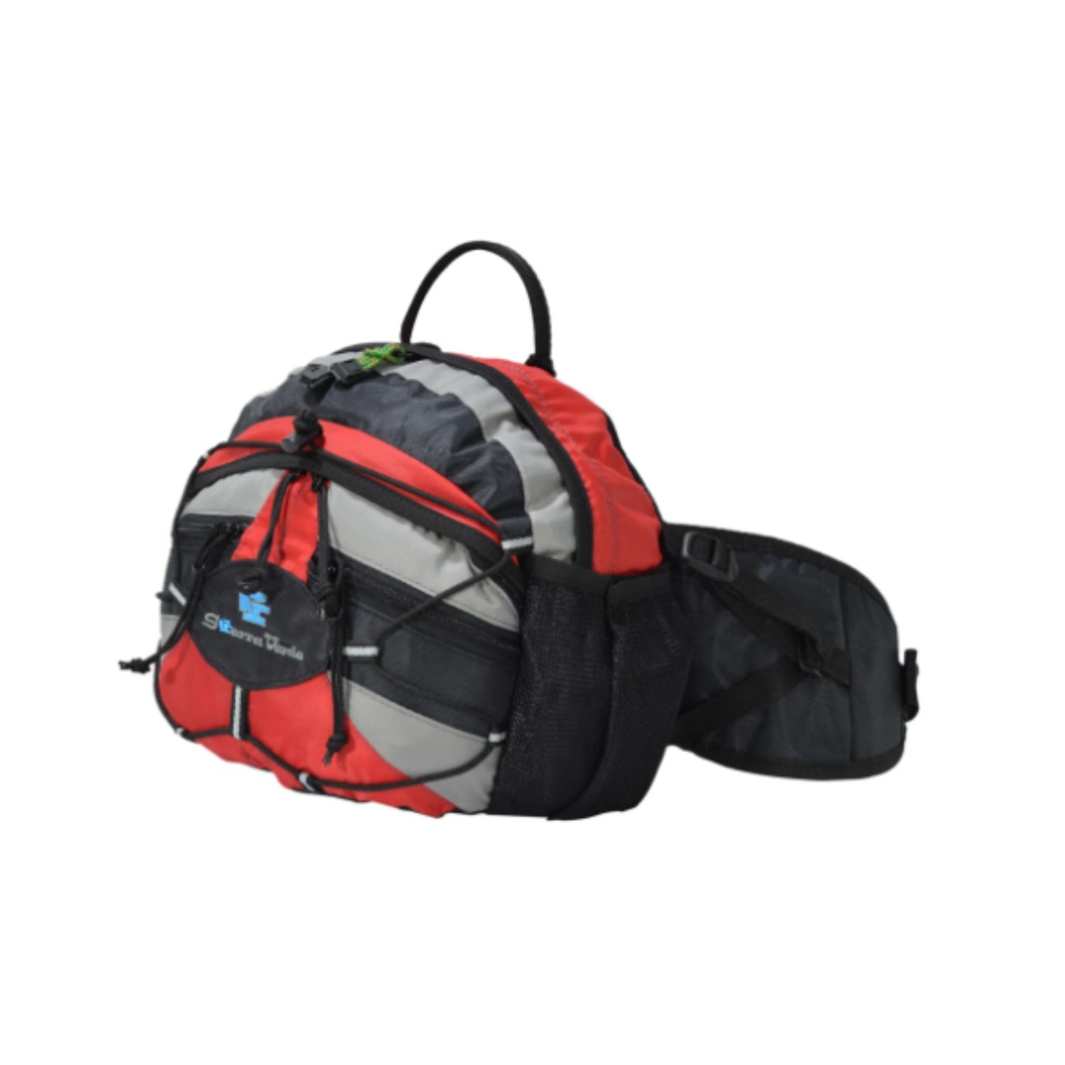 Características: Canguro con amplia capacidad, tres bolsas al frente con cierre, bolsas laterales de malla, resorte de sujeción, salida para manguera de hidratación, faja lumbar ajustable y respaldo acolchado.