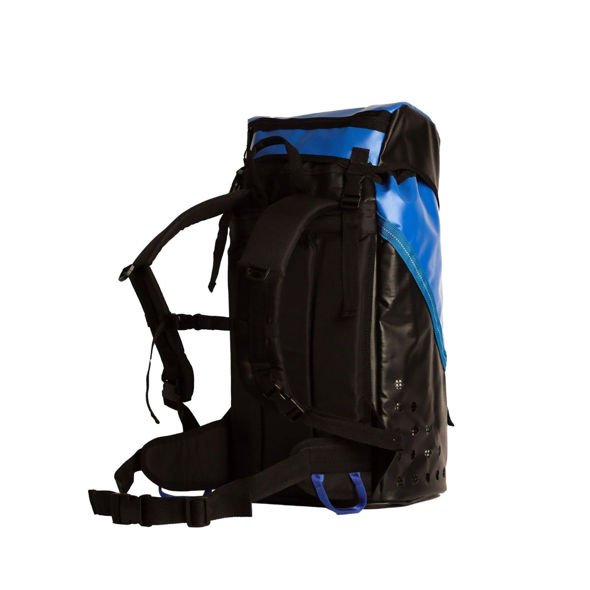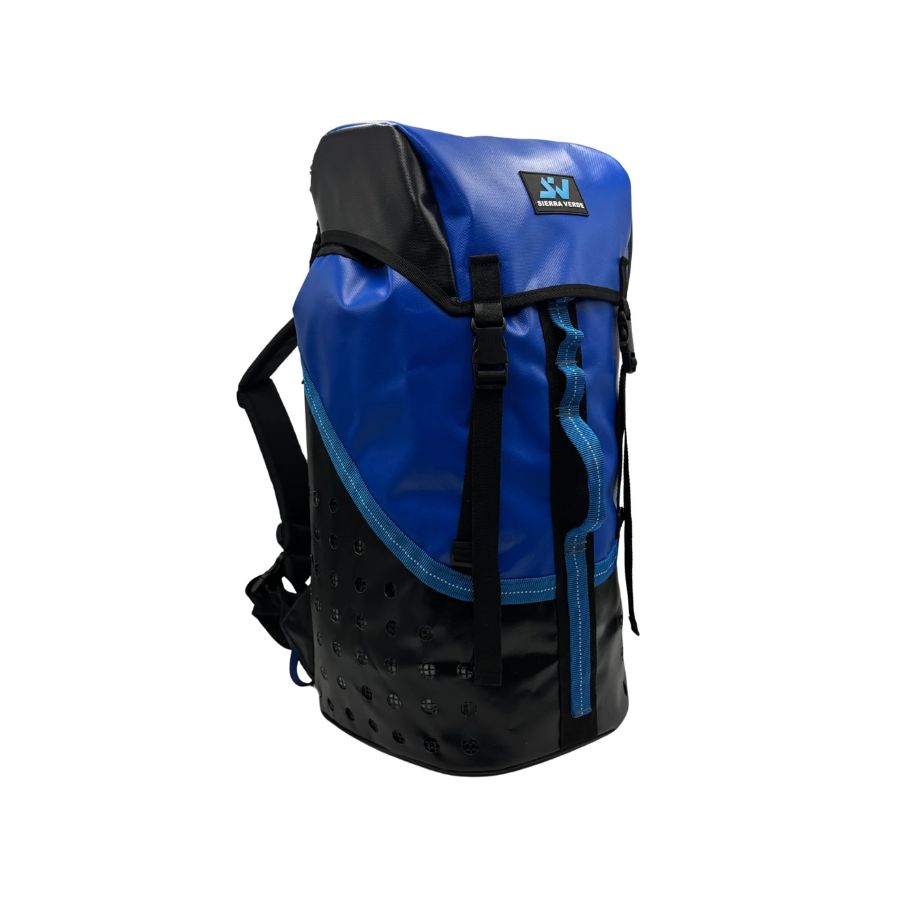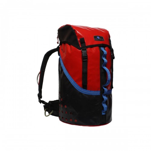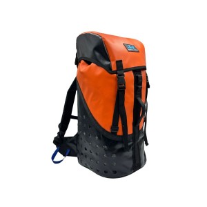 Características: Mochila para cañonismo tipo costal de cerrado con cordino, con cargadores y faja, sistema de desagüe en base y costados, gorro y asa frontal de cinta tubular. Malla plástica en el interior. Respaldo con relleno de ½ pulgada de alta densidad.